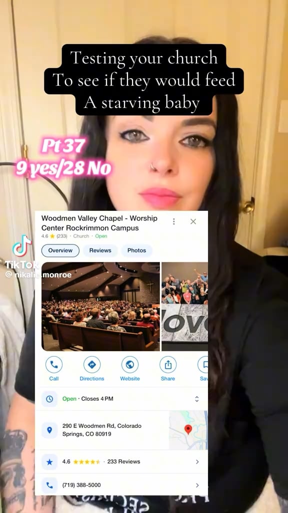 Tik Tok personality Nikalie has been calling churches to see if they would provide formula for her fictitious baby during the government shutdown/SNAP freeze. So far she’s gotten 9 yes/ 28 no. Among the few yeses were a mosque, Buddhist temple and a historically black church