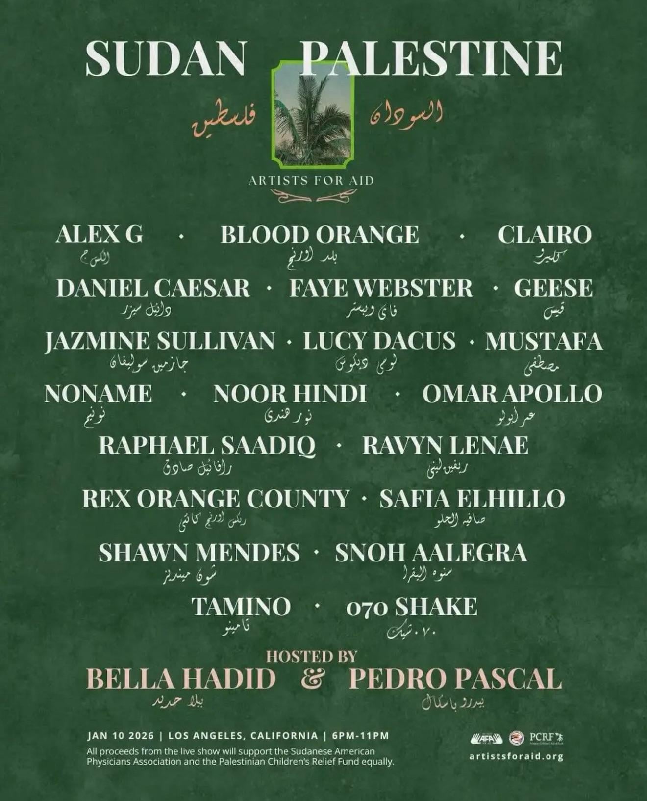 lineup for artists for aid, hosted by bella hard and pedro pascal