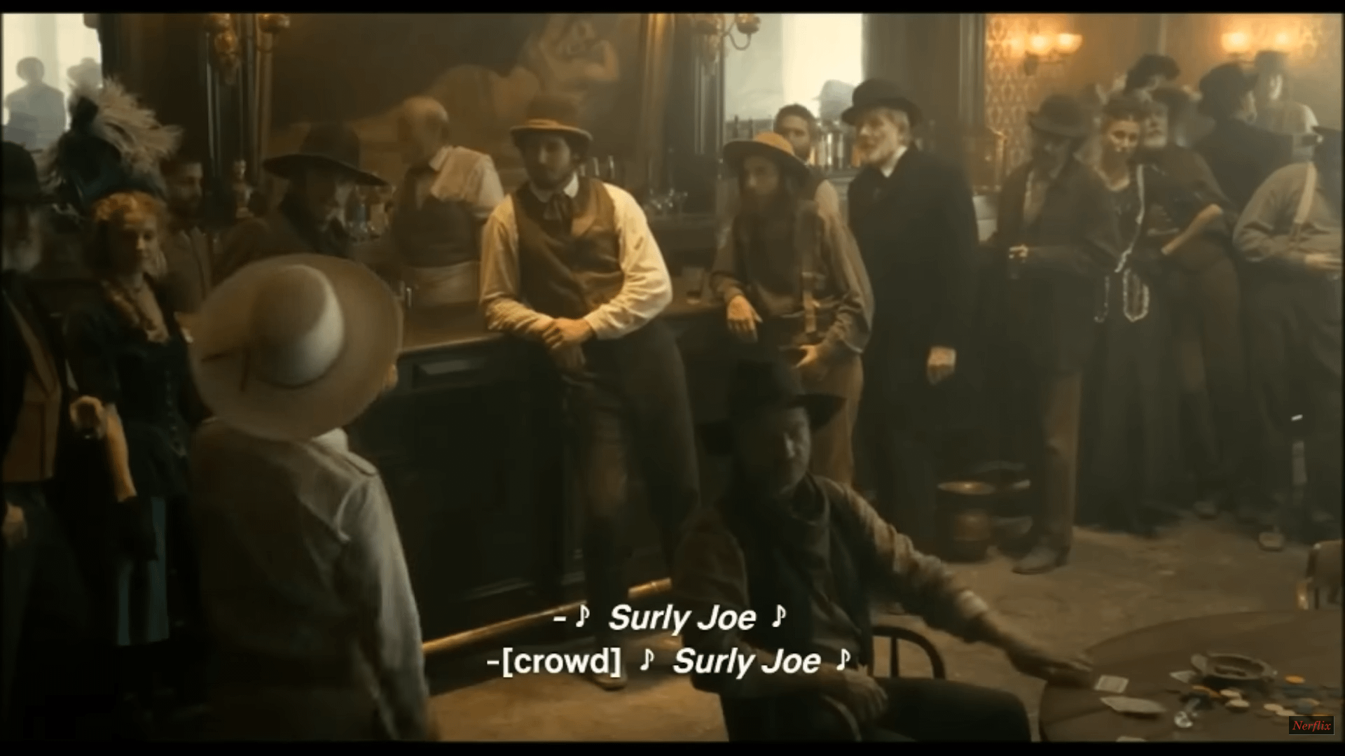 In The Ballad of Buster Scruggs (2018), after Buster kills Joe and starts singing, you can see his opponent drops his cards in frustration, suggesting that he was holding the winning hand.