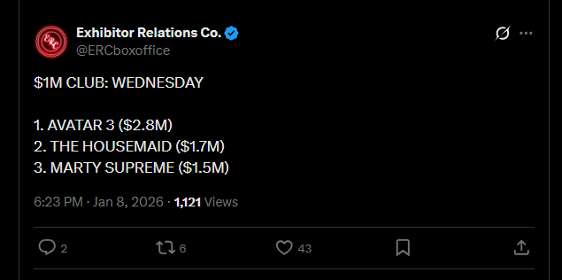 Monday and Tuesday followed Avatar 2’s 4th week pretty closely with Monday even being higher, but this seems to have dipped down almost 400k below A2’s Wednesday. I’m assuming that’s just how it goes