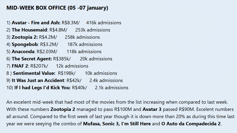 Brazil mid-week (05-07 january). Most movies on the list increased compared to last week as Zootopia 2 passes R$100M by ThatWaluigiDude