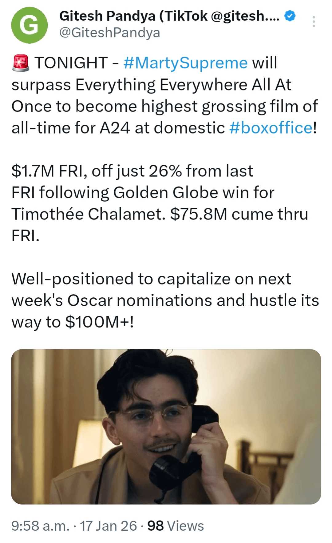Tonight, Marty Supreme will surpass Everything Everywhere All At Once to become the highest grossing film of all-time for A24 at the domestic box office. $1.7M Friday, -26% from last Friday, $75.8M cume. Well-positioned to capitalize on next week’s Oscar nominations and hustle its way to $100M+.