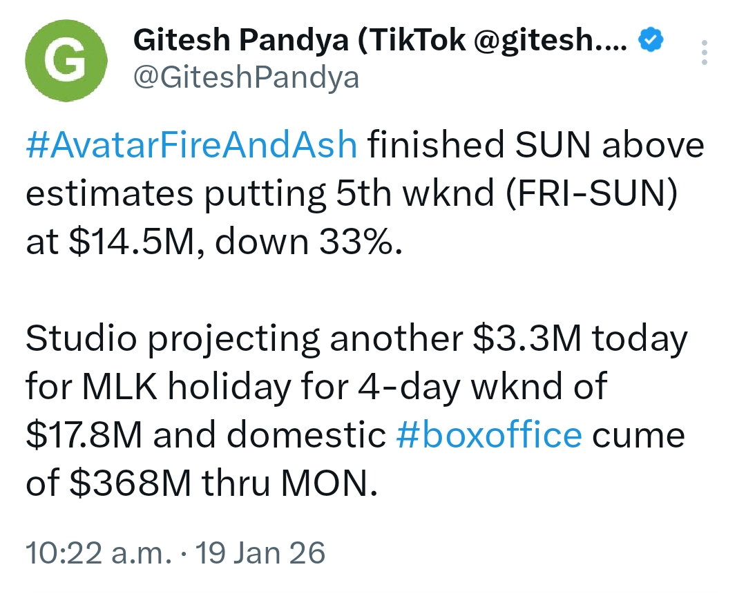 Avatar: Fire And Ash finished Sunday above estimates, putting the 5th 3-day weekend at $14.5M, down 33%. Studio projecting another $3.3M today for MLK holiday, for a 4-day weekend of $17.8M, and a domestic box office cume of $368M through Monday.