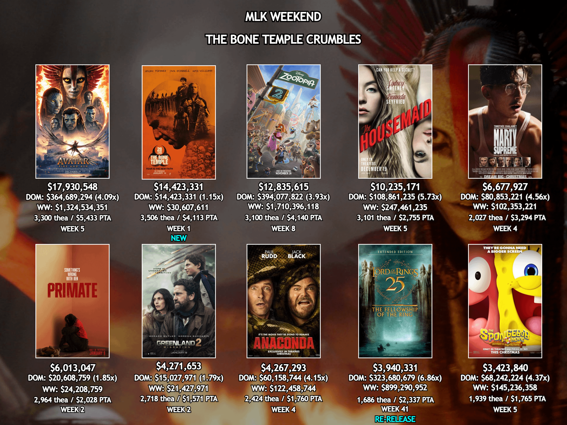 Over the MLK weekend, Avatar: Fire and Ash held up the top spot for the fifth week in a row. The weekend's other release, 28 Years: The Bone Temple greatly disappointed in its debut, albeit it's not a surprising result.
