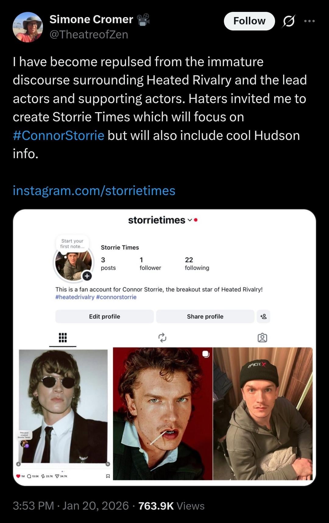 “I have become repulsed from the immature discourse surrounding Heated Rivalry and have therefore decided to create an instagram page where immature parasocial fans can lust after Connor Storrie.”