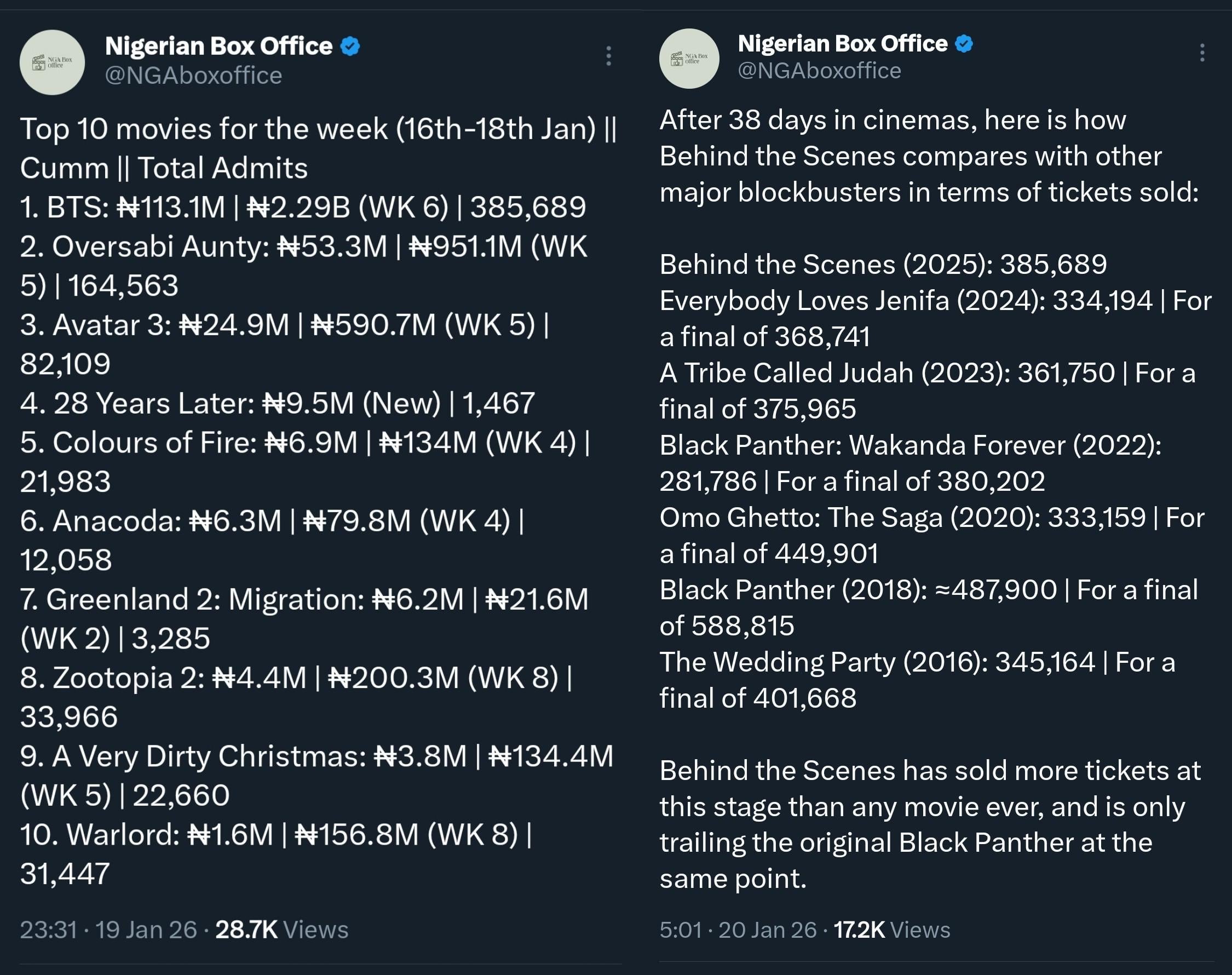 🇳🇬 Nigerian Weekend Box Office January 16-18: ‘Behind The Scenes’ is on its way to smash Nigerian box office records. by AGOTFAN
