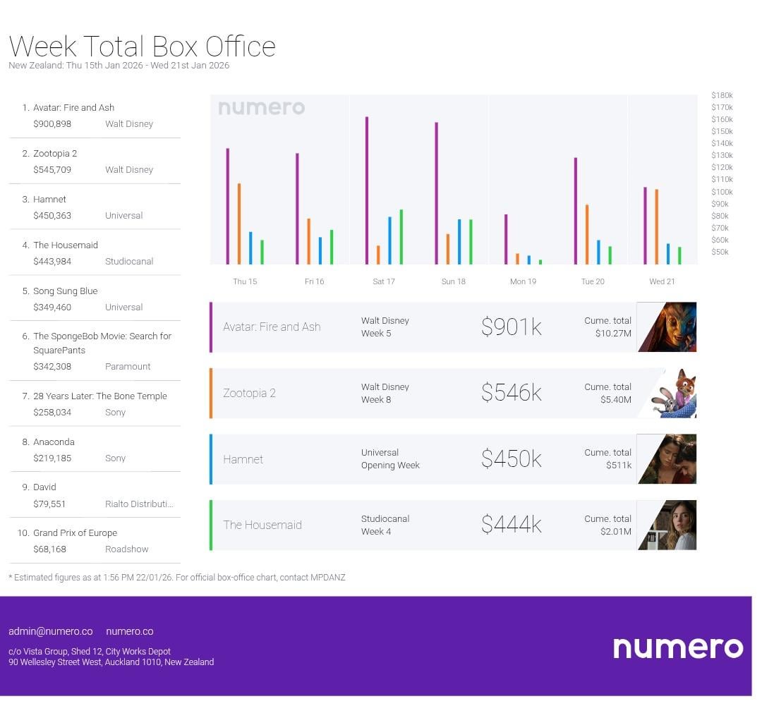 Avatar: Fire and Ash remained in the top spot in New Zealand, earning $901k in its fifth week in cinemas and bringing its box office total to $10.27M. Zootopia 2 placed 2nd and earned $546k in its eighth week, bringing its total to $5.40M. Hamnet took 3rd place in its opening week with $450k