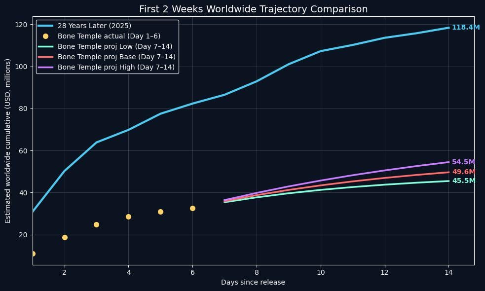 I forced a standard saturation curve to passes exactly through the real Day-6 number.