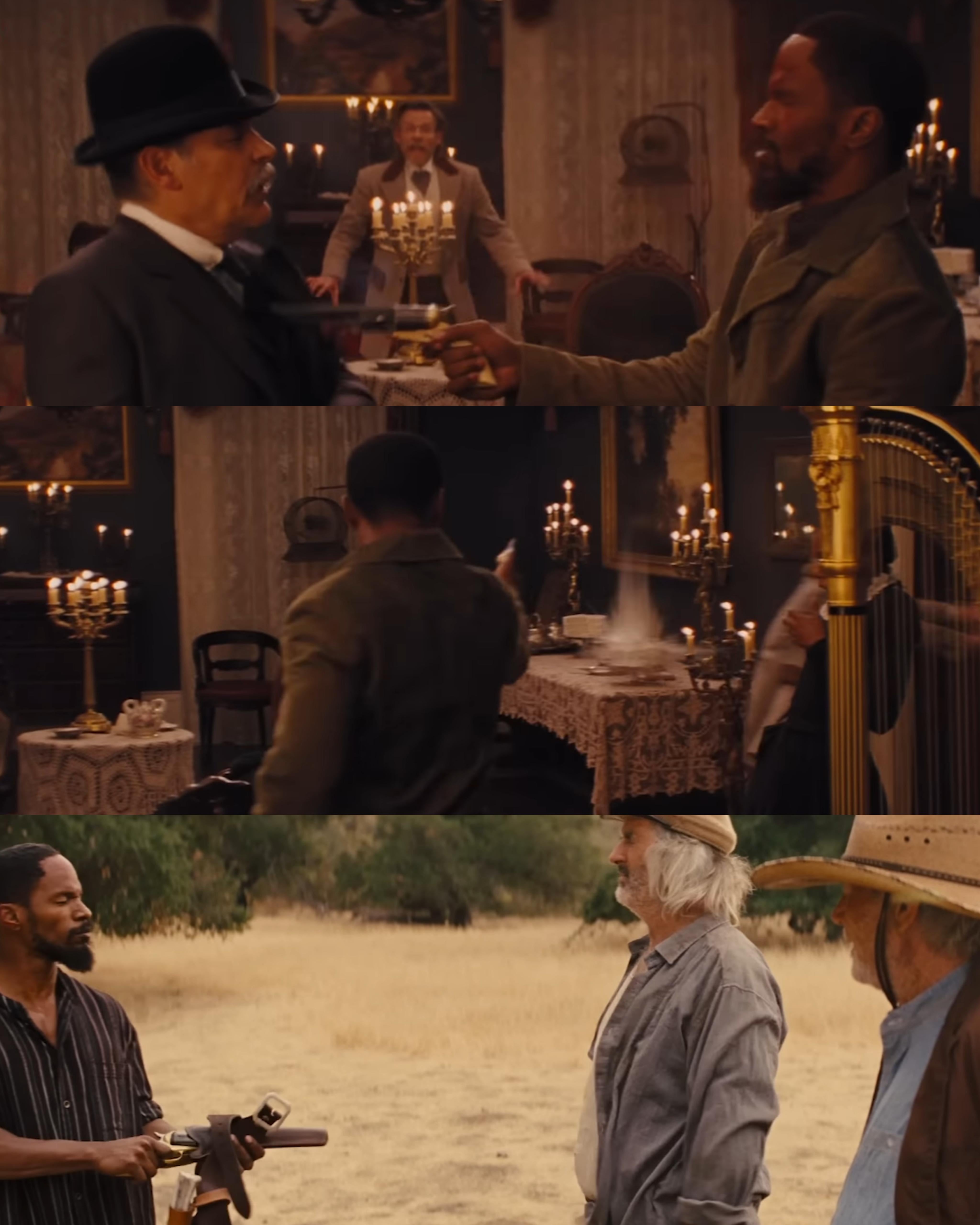 Additionally, James Remar (pictured first above) died twice in this film. Besides being the henchman, he was also Ace Speck, one of the Speck brothers who took Django and the other slaves at the beginning of the film, and that was killed by Schultz.
