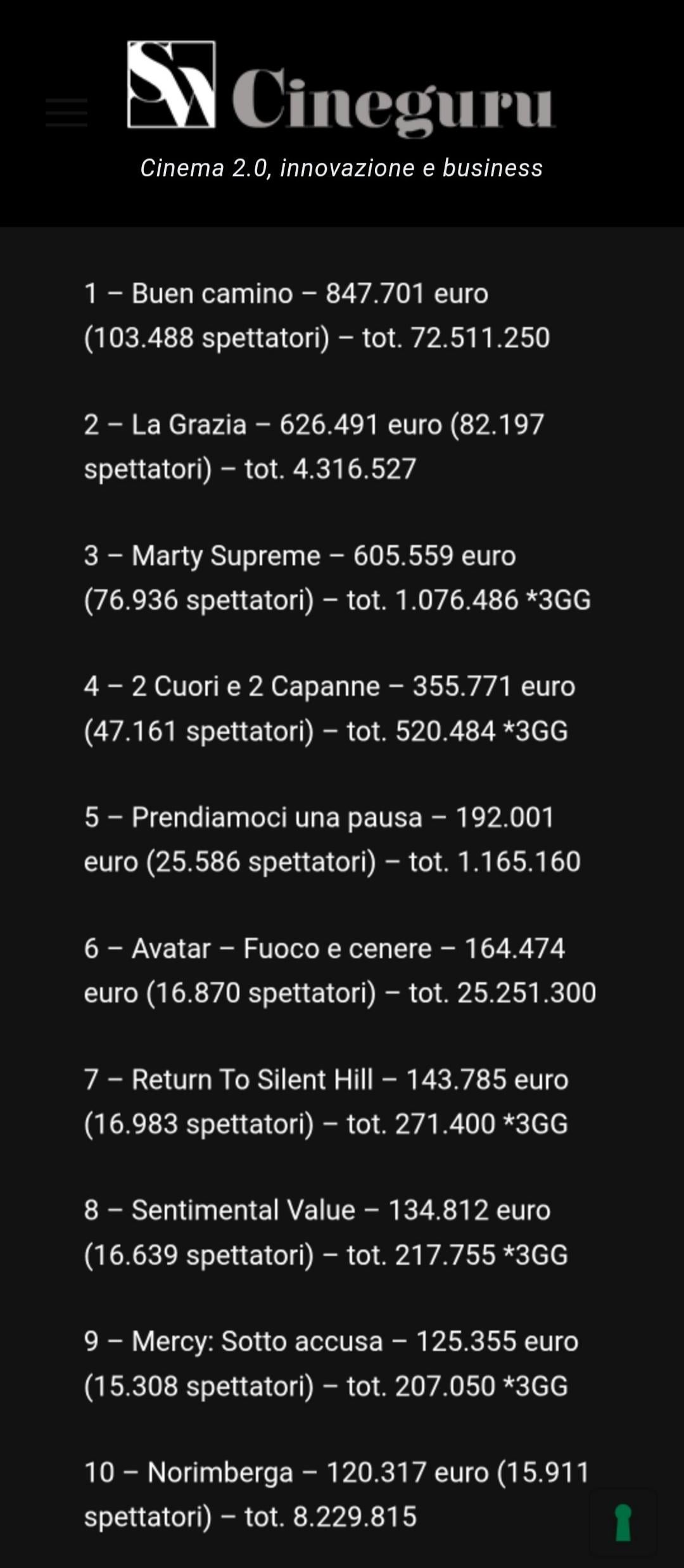 Source: https://cineguru.screenweek.it/2026/01/buen-camino-portentoso-va-oltre-i-72-milioni-il-box-office-di-sabato-24-gennaio-48970/ by AGOTFAN