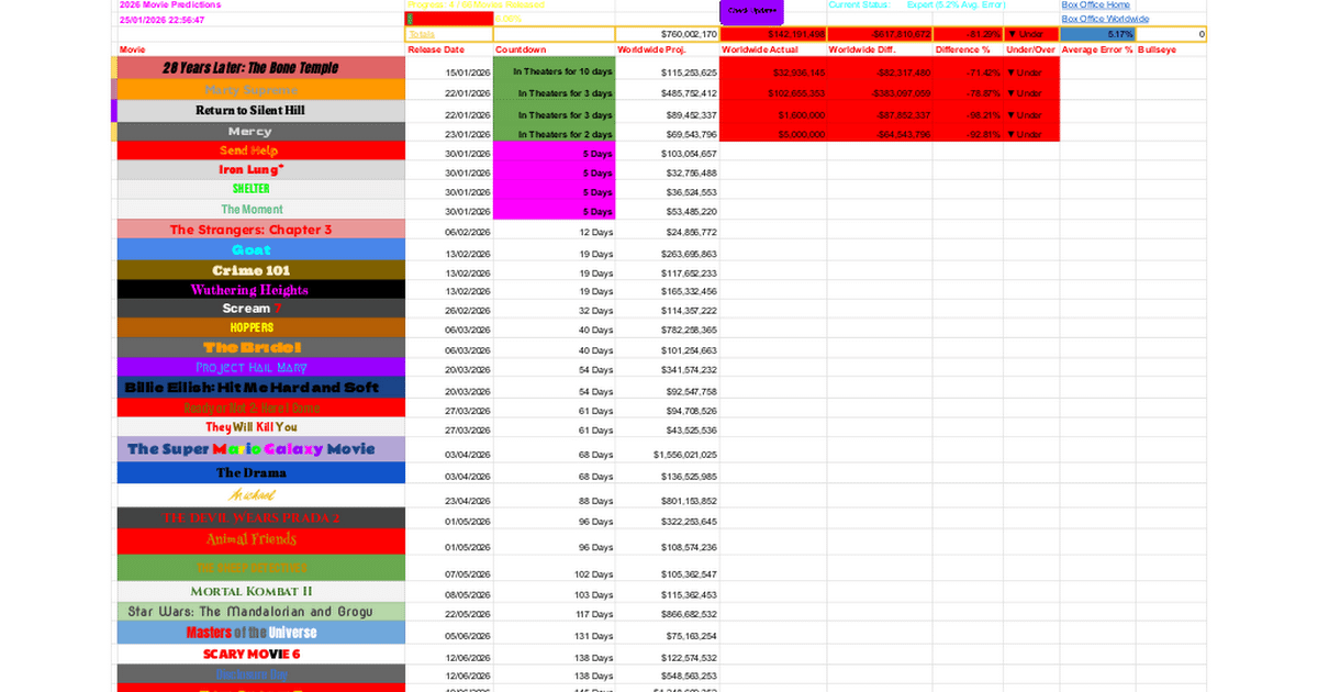 I created this spreadsheet for me and my gf to compete against each other in predicting some movies through 2026. First time of doing it, was just looking for any feedback or improvements you lot would think of. Thanks! by benjibp2208
