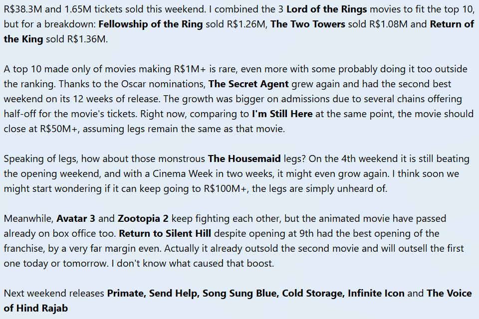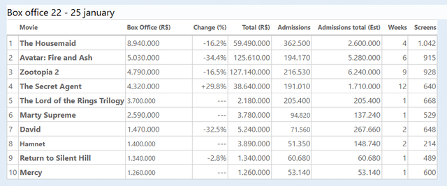 Brazil weekend (22-25 january). Secret Agent grows after Oscar nominations, Silent Hill sees best opening from the franchise and The Housemaid is still going beast mode