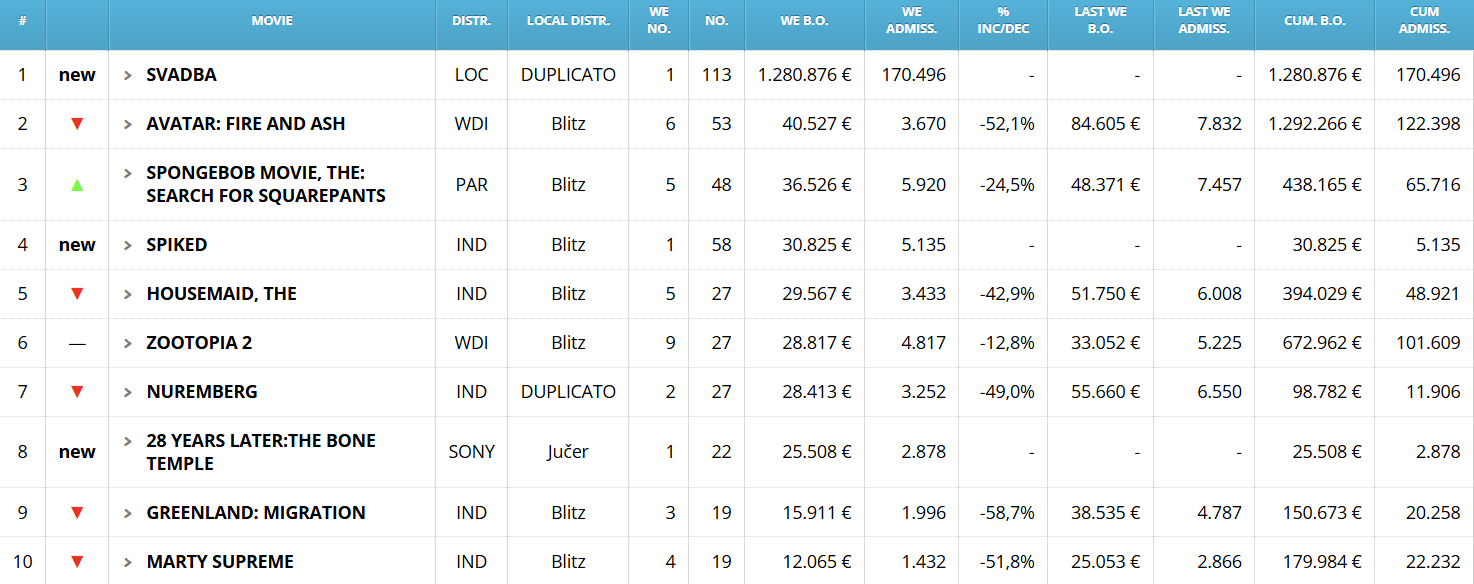 Avatar: Fire and Ash dethroned by local movie Svadba, which broke record for biggest local movie opening ever in history, along most attended local movie of this century. by Crisbo05_20