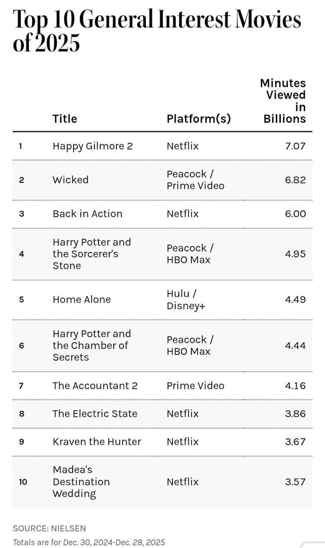 This must be the first time Nielsen separated the kids movies from General movies. Doesn’t make sense to me. Anyway, that Moana remake is gonna make a ton of money. Frozen’s longevity is insane, and I’m surprised Encanto is nowhere to be seen on the list.