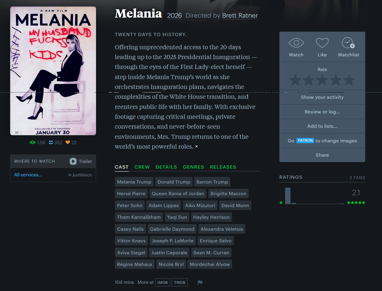 Melania (2026) Poster in Letterboxd. Interesting take in the text written over the poster.