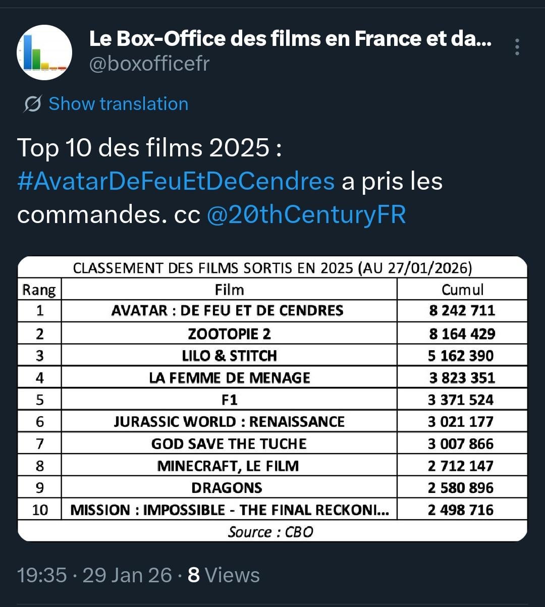 AGOTFAN on January 29, 2026 12:42 pm Only 1 local French film at #7 God Save The Tuche, the rest are Hollywood. Pretty sad affair considering France is the birth of cinema.