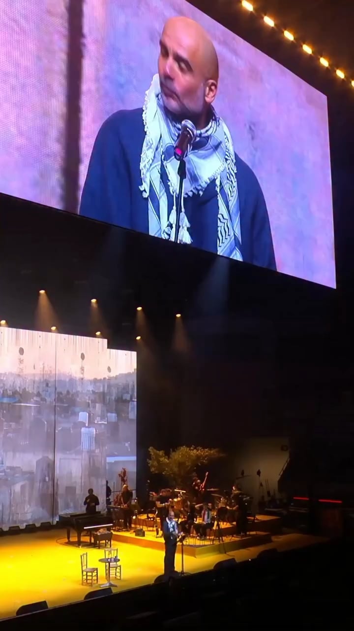 Manchester City manager Pep Guardiola speaks for the children of Gaza during the Act x Palestine charity event, wearing a Palestinian keffiyeh, in Barcelona.