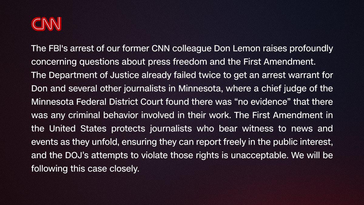 CNN, Don Lemon’s former employer, have released a statement saying that Lemon’s arrest by the FBI “raises profoundly concerning questions about press freedom and the First Amendment.”