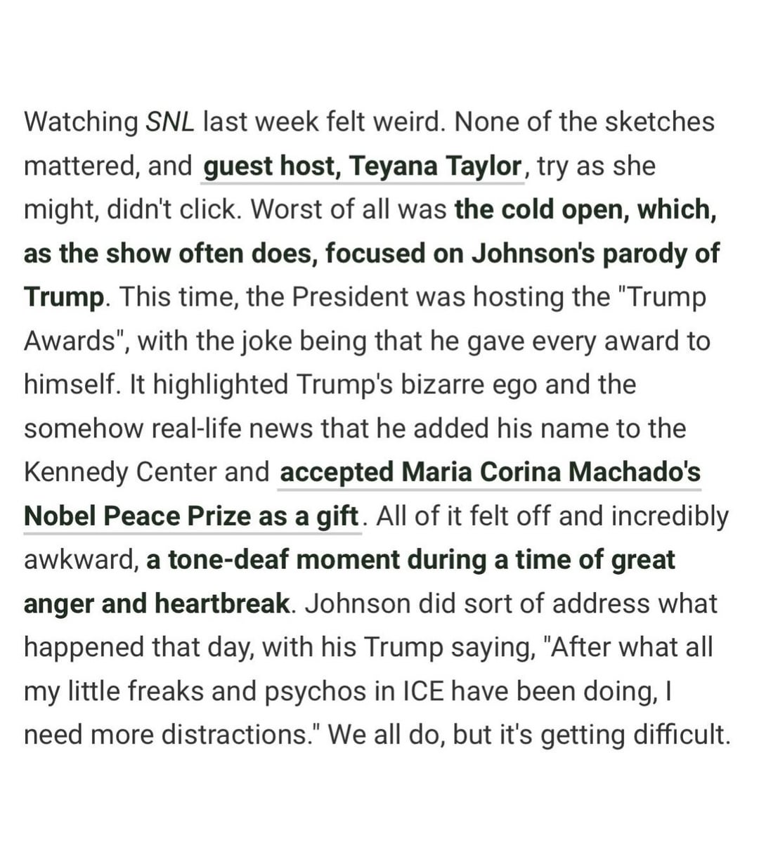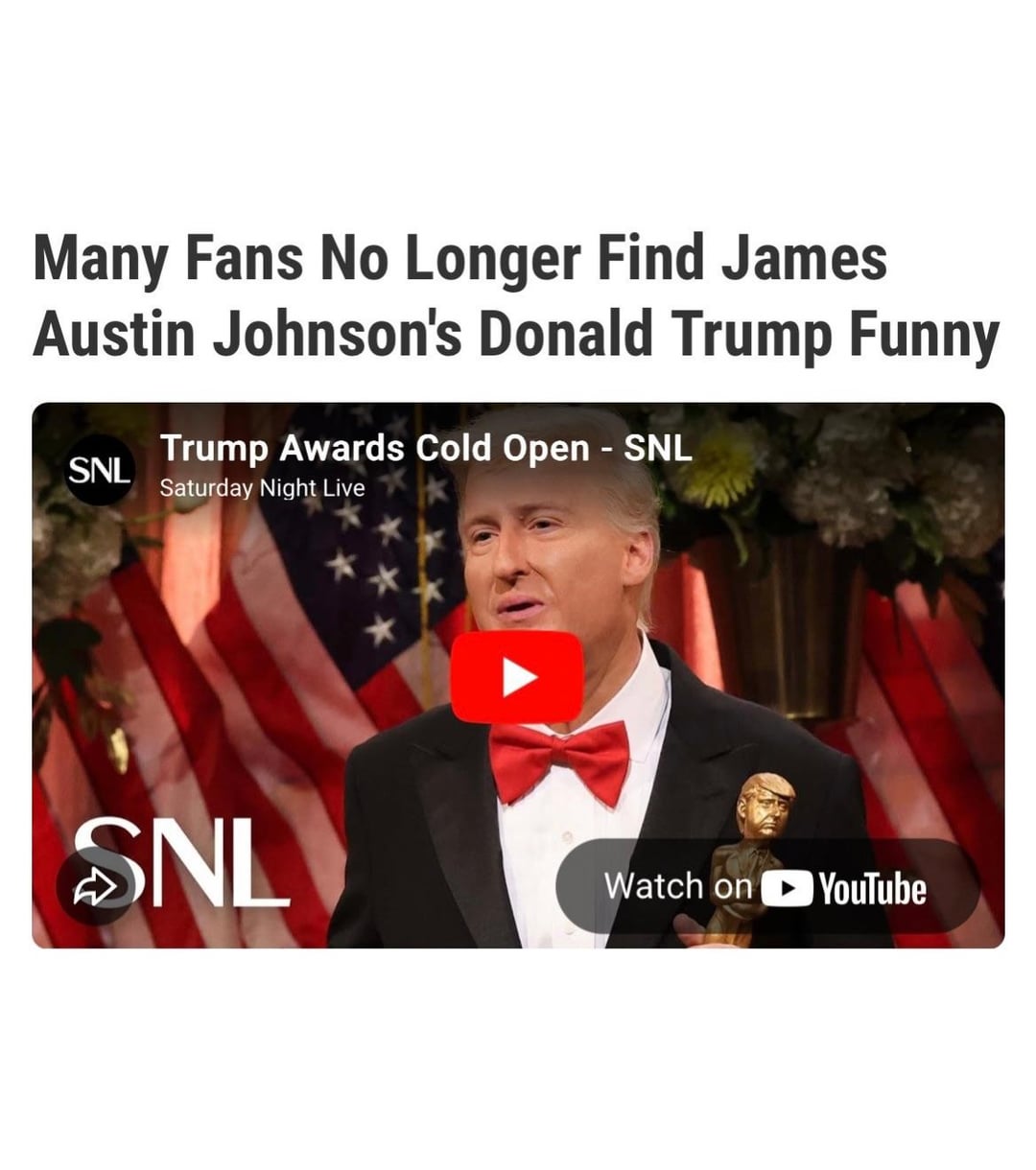Honestly, James Austin Johnson is great it’s just hard to laugh when real life keeps outdoing the joke every week.