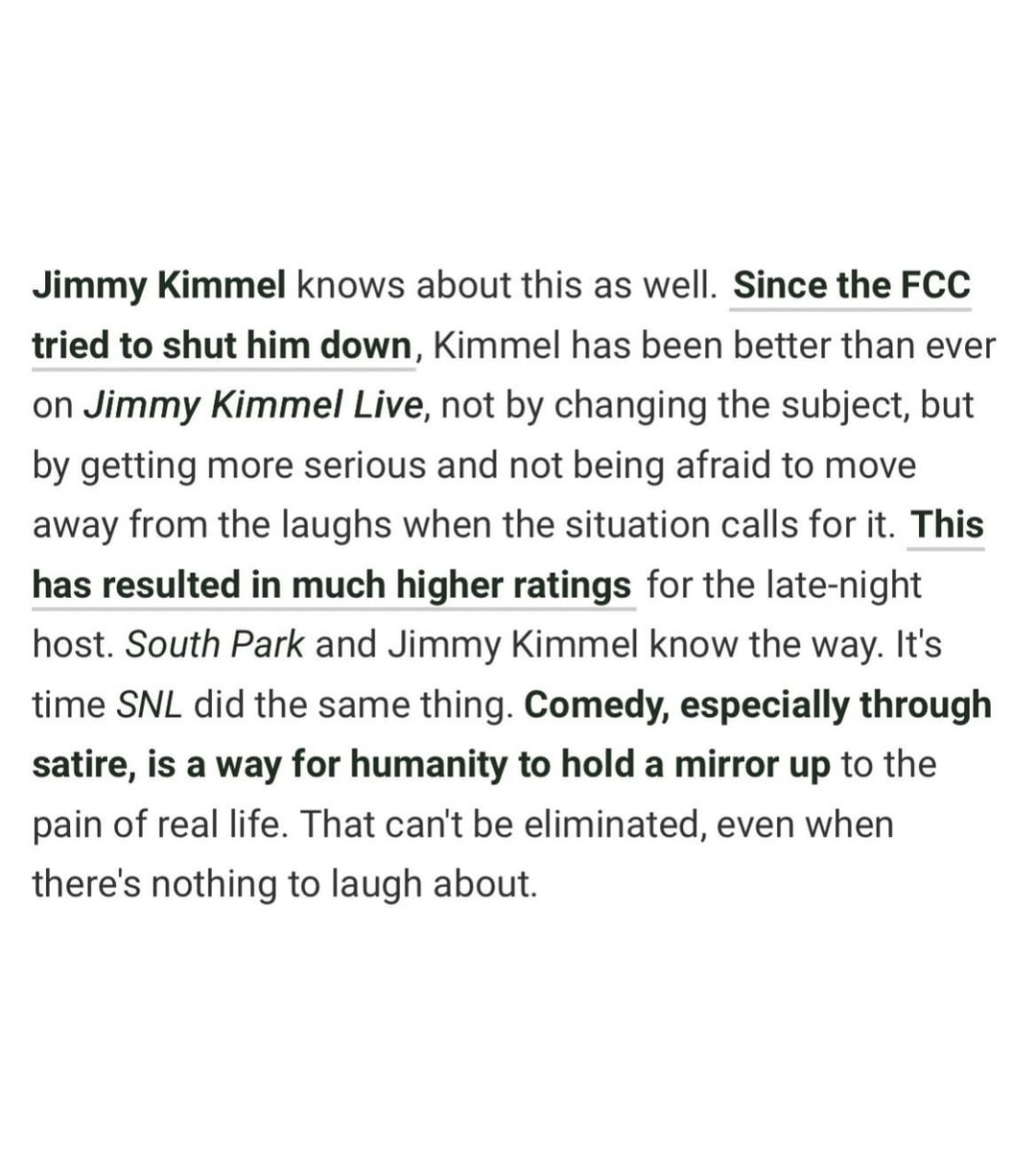 They lost their edge a long ass time ago. Lorne’s whole “bipartisan” stance makes it all milquetoast.