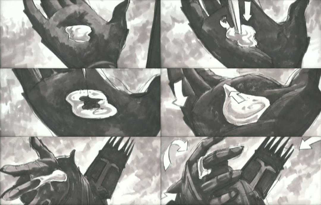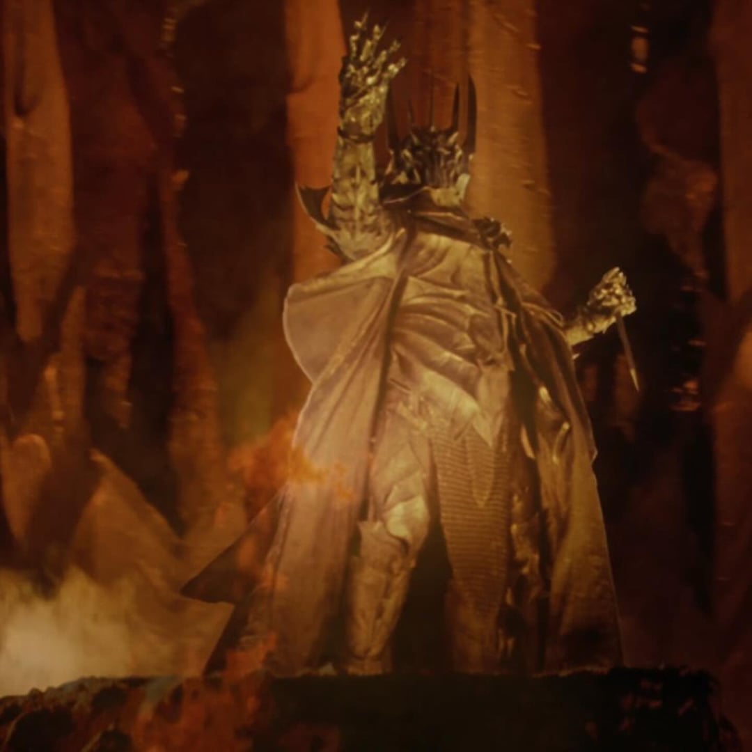 In The Lord of the Rings: The Fellowship of the Ring (2001), Sauron can be seen holding a dagger in his left hand during the prologue. This is a remnant of a sequence that would have shown him creating the Ring in which he stabs his palm, letting his blood mix with molten gold.