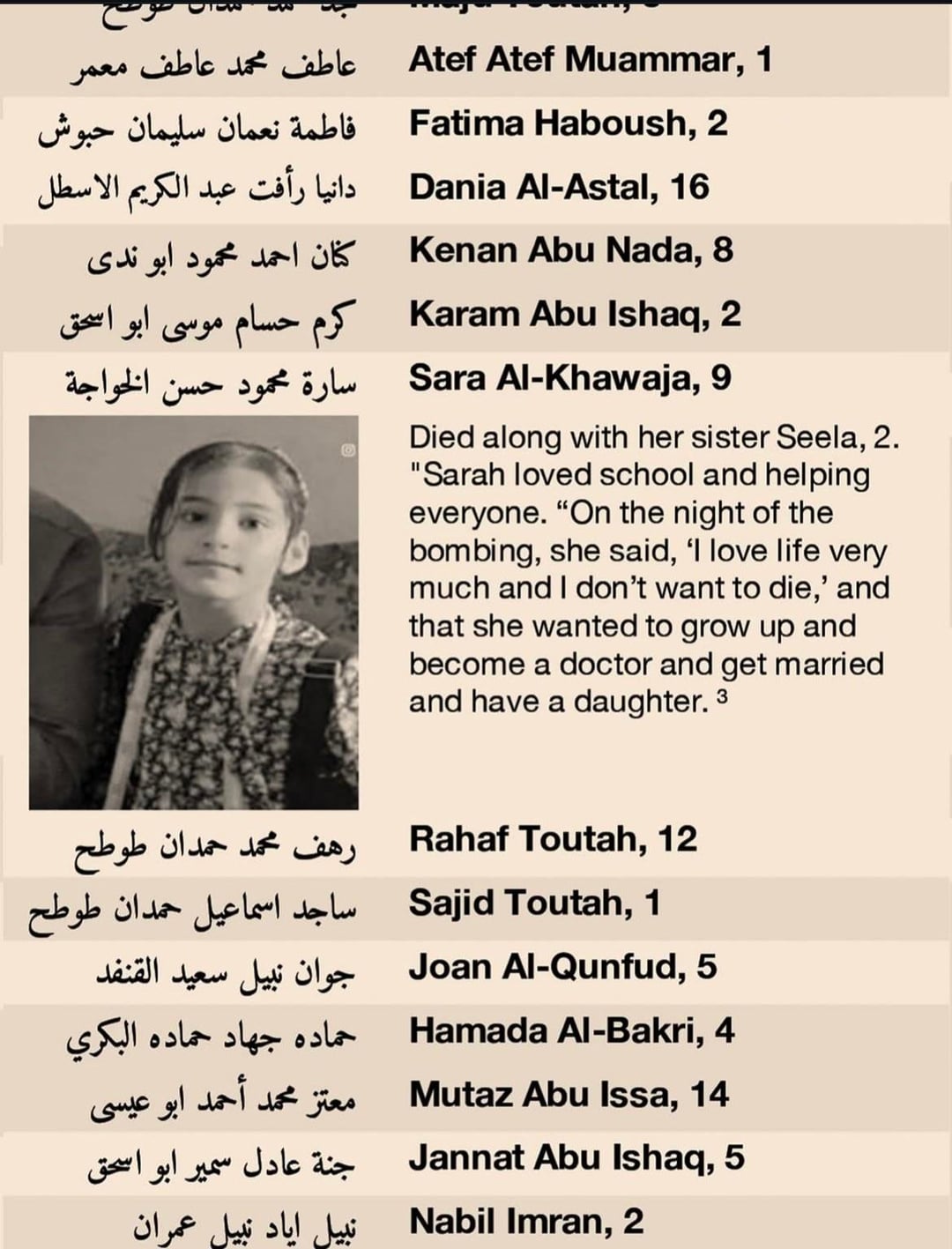 “Sara (9) loved school and helping everyone, wanted to grow up, be a doctor, get married and have a daughter ”