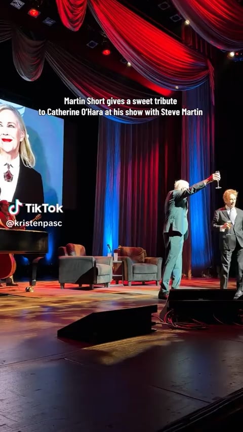 Martin Short and Steve Martin are standing on a stage in suits. They’re holding two champagne glasses. Behind them, there are two chairs and a projector, showing a picture of the late Catherine O'Hara smiling. Martin Short gives the following speech.