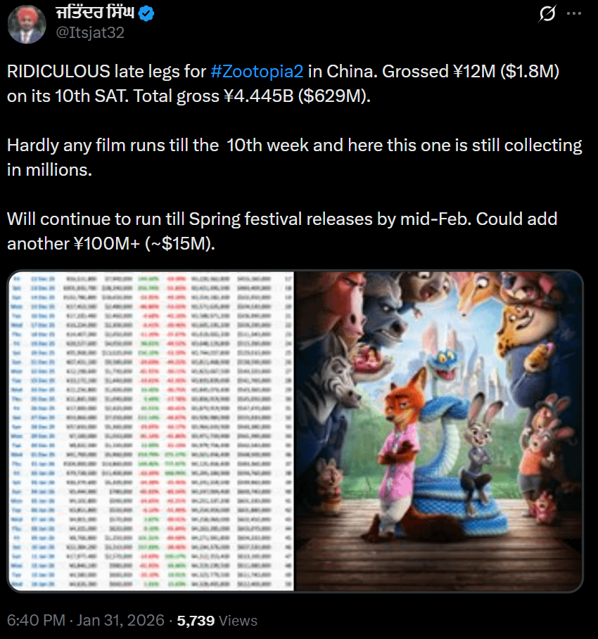 Zootopia 2 late legs in China is Insane. This type of ridiculous legs for a hollywood movie had never be seen in China. Looks like final total of 645 million dollar. This is power of incredible WOM.