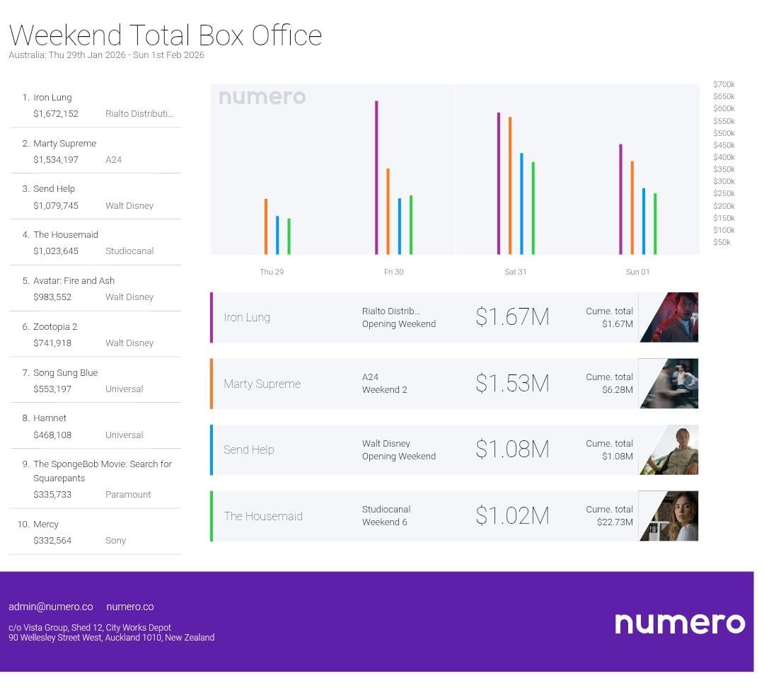 Iron Lung debuted at No. 1 in Australia with $1.67M. 🦘 Marty Supreme followed in 2nd place, adding $1.53M. 🐨 Send Help took the 3rd spot in its opening weekend with $1.08M