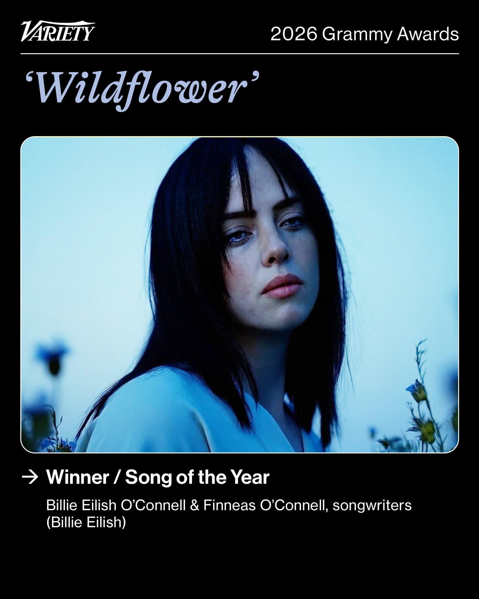 Billie is 24 and she’s won Song of the Year 3 times – 2020 Bad Guy, 2024 What Was I Made For? 2026 Wildflower – the most awarded in that category EVER