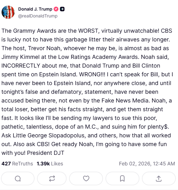 Funny how he’s threatening to sue for defamation. But in order to win that case he’d have to prove what Noah said about him being on the island is false. So go ahead Donald, make our day.