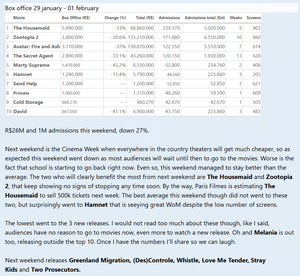 Brazil weekend (29 january – 01 february). As audiences wait for the Cinema Week, The Housemaid and Zootopia 2 can’t stop won’t stop