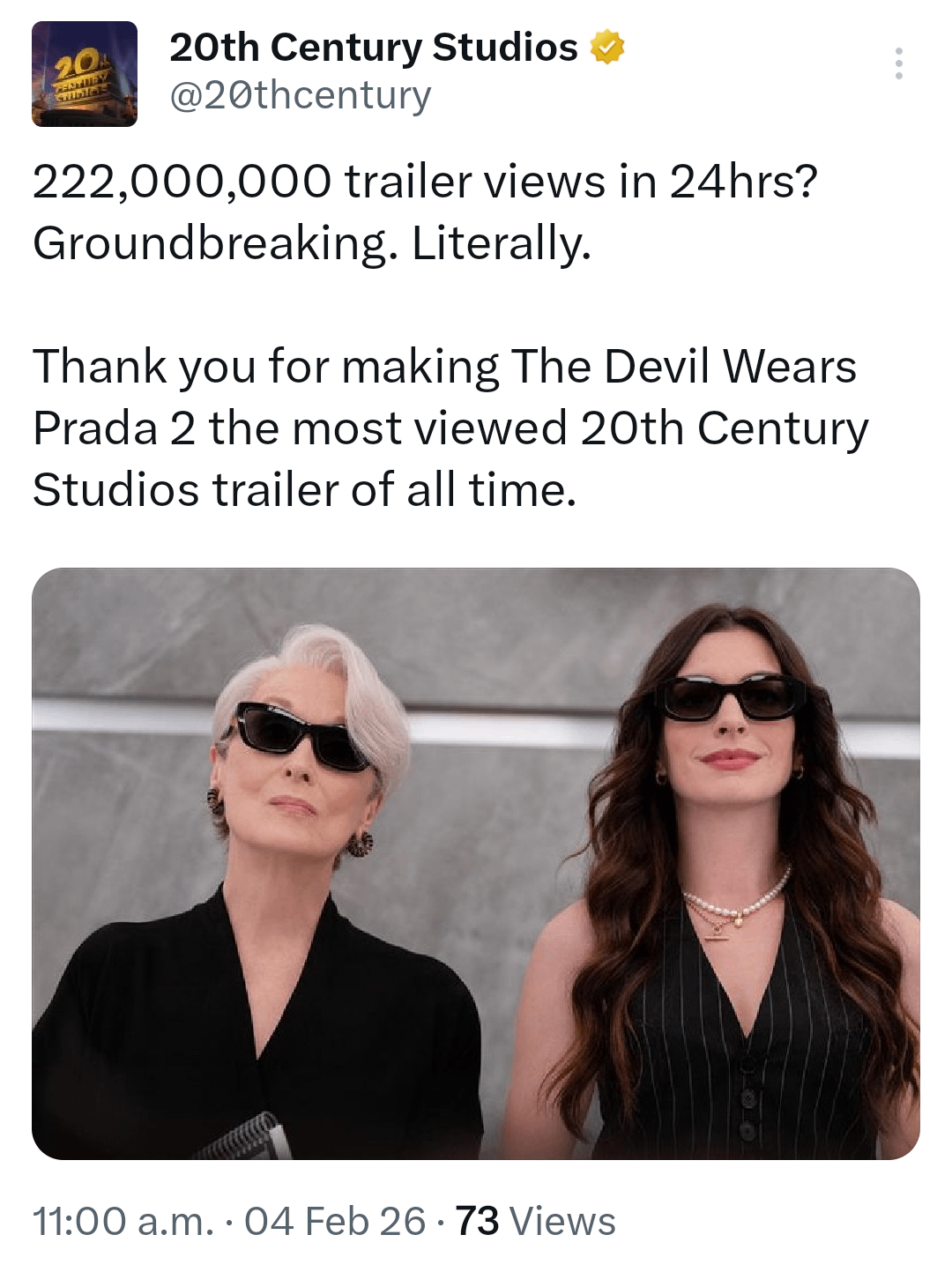 If this is a legacy sequel done right, it can truly be huge. Obviously we know that trailer views don’t mean much, but Devil Wears Prada is just beloved.