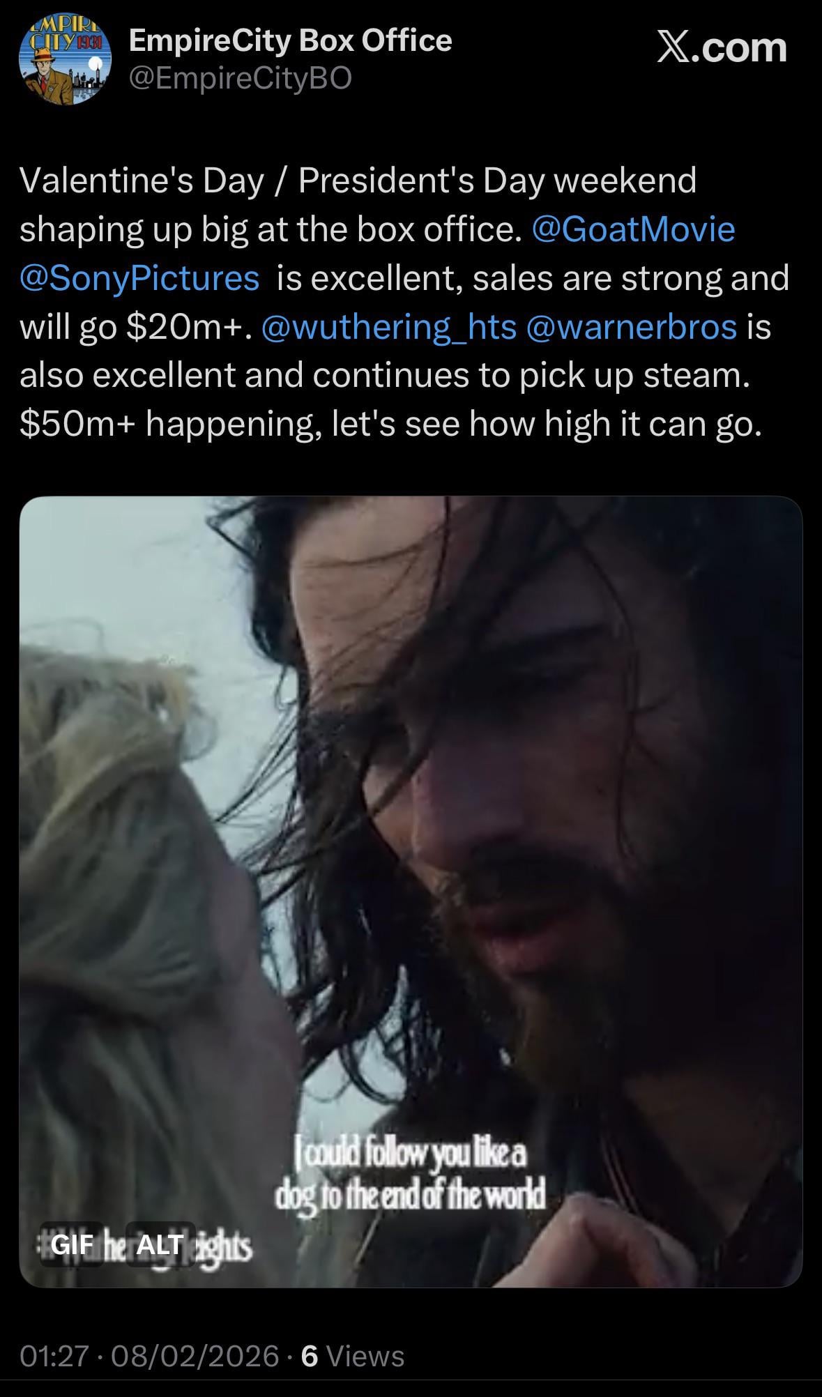 Valentine’s Day / President’s Day weekend shaping up big at the box office. Sony’s Goat is excellent, sales are strong and will go $20m+. WB’s Wuthering Heights is also excellent and continues to pick up steam. $50m+ happening, let’s see how high it can go.