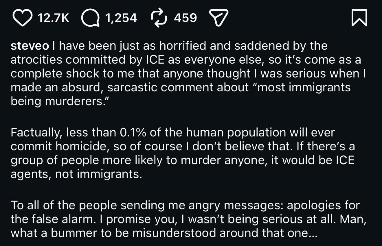 I’m sorry but I’ve seen a couple of my favorite people go on his podcast so I’ve seen how he is enough to know that his take was not sarcastic and this is a horrible way to shirk accountability. The right thing to do these days when you’re caught being horrible is 1- fully digest why people are mad 2- explain how you understand it 3- go above not doing it again, become outspoken about why it was wrong and why other people shouldn’t do it either
