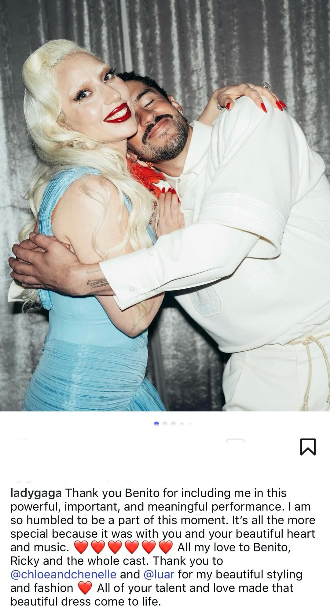 Lady Gaga thanks Bad Bunny for letting her join his Super Bowl Halftime Show: “Thank you Benito for including me in this powerful, important, and meaningful performance. I am so humbled to be a part of this moment.”