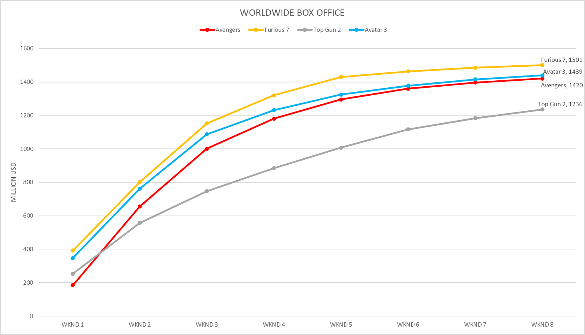 Avatar 3 +$24.2M from last Sunday continues to keep pace with Avengers +$23.2M. Avengers had not released in Japan at this point, it earned $65.9M after this point not including Japan. If Avatar can keep up it with that it will finish just over $1.5B. Expect floor of $1.485B.