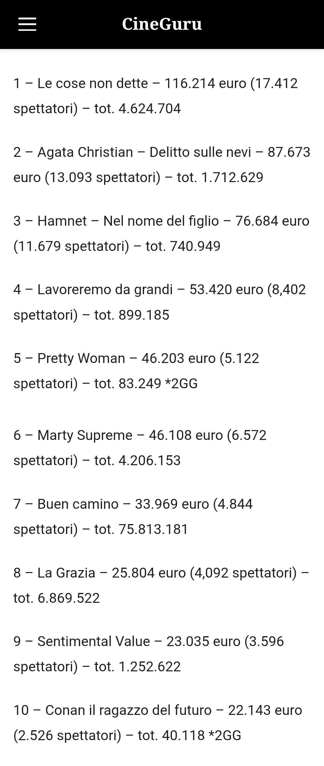 Marty Supreme takes sixth place with €46,108 (-51%) and an average of €176 in 262 theaters (344). The Oscar-nominated film's total gross has increased by €4,206,153 since January 22. According to data from boxofficemojo.com, the film is currently grossing double the Spanish box office.