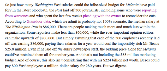 AV Club: Melania’s budget could’ve paid the salaries of every fired Washington Post employee, three times over.