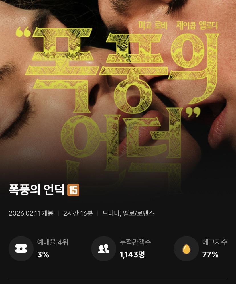 Wuthering Heights starts 77% Cgv golden egg score in Korea equivalent to C cinemascore or worst