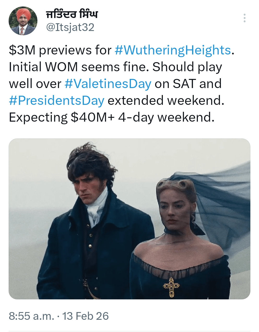 $3M previews for Wuthering Heights. Initial word of mouth seems fine. Should play well over Valentine’s Day on Saturday and Presidents’ Day extended weekend. Expecting $40M+ 4-day weekend.