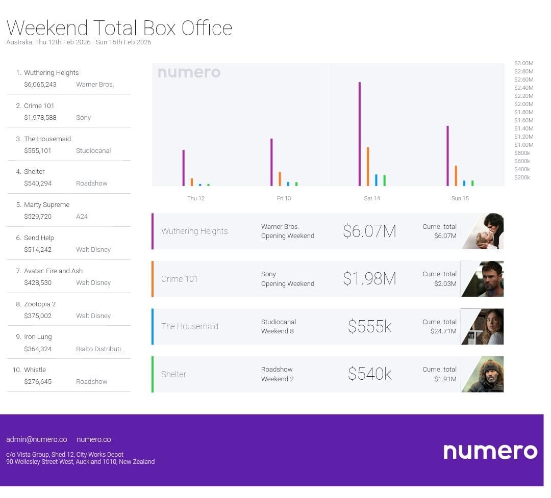 “Wuthering Heights” took the top spot in its opening weekend in Australia with $6.07M. 🦘Crime 101 also opened over the weekend, taking 2nd place with $1.98M. 🐨The Housemaid climbed back up to 3rd place in its eighth weekend since release, earning $555k