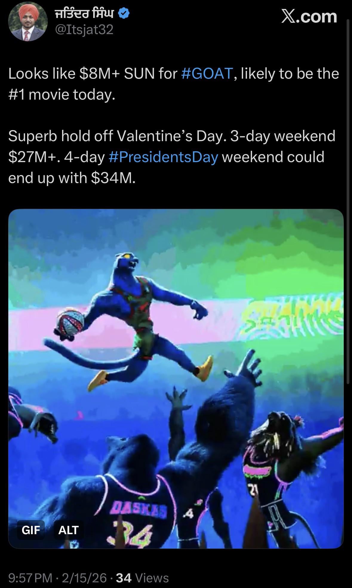 Looks like $8M+ SUN for #GOAT, likely to be the #1 movie today. Superb hold off Valentine’s Day. 3-day weekend $27M+. 4-day #PresidentsDay weekend could end up with $34M.
