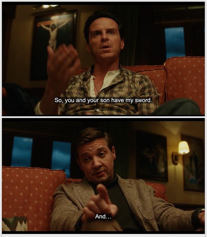 In Wake Up Dead Man (2025), as the group is hatching a plan to take down evil, A. Scott’s character proclaims to join the cause, saying “You have my sword”. Movie cuts to Jeremy Renner’s character, who starts with “And…”, cutting away before him saying “…my bow”. A play with LotR and Hawkeye.