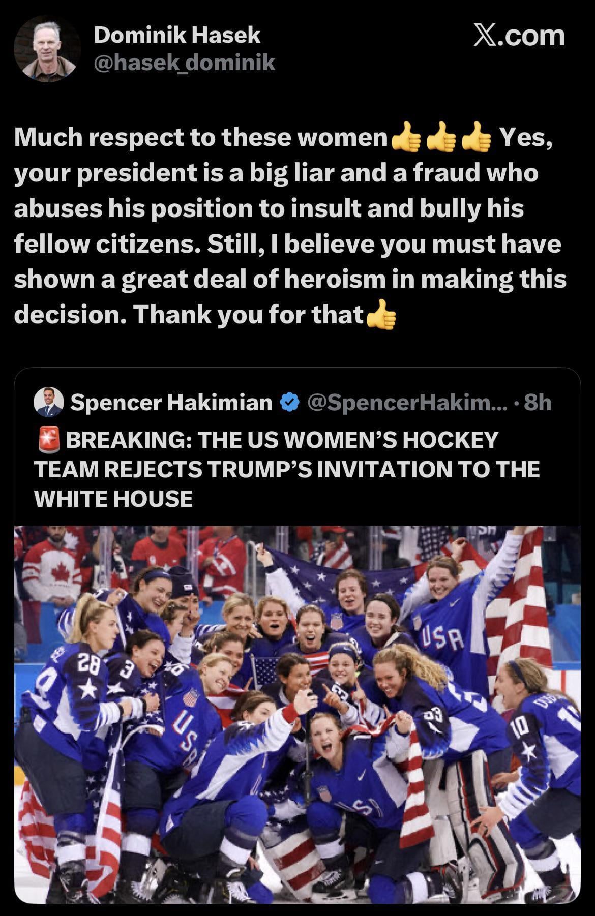 Hockey Hall of famer and NHL Legend Dominik Hasek: Much respect to these women. Yes, your president is a big liar and a fraud who abuses his position to insult and bully his fellow citizens. Still, I believe you must have shown a great deal of heroism in making this decision. Thank you for that
