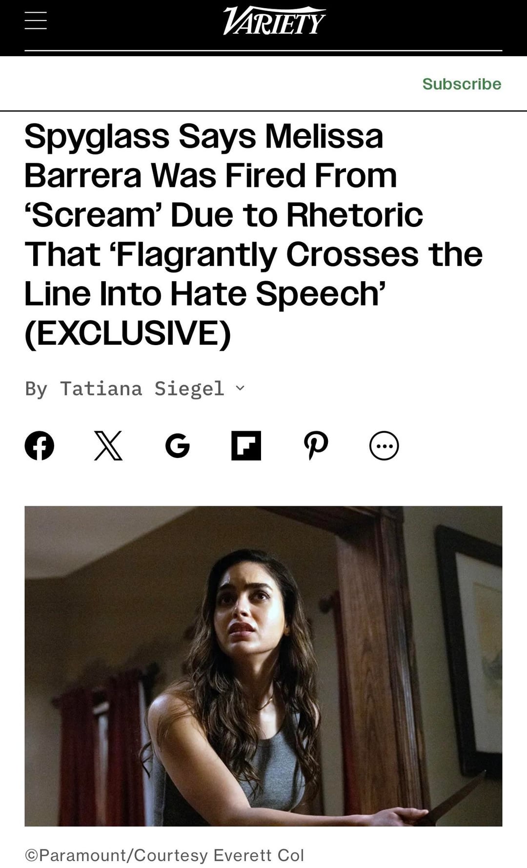 Variety is now claiming Melissa Barrera was quietly dropped from Scream 7. In reality, Spyglass told Variety and Variety published she was let go due to antisemitism. Don’t let Variety and Spyglass rewrite what they did. Melissa was not quietly let go, she was publicly smeared.