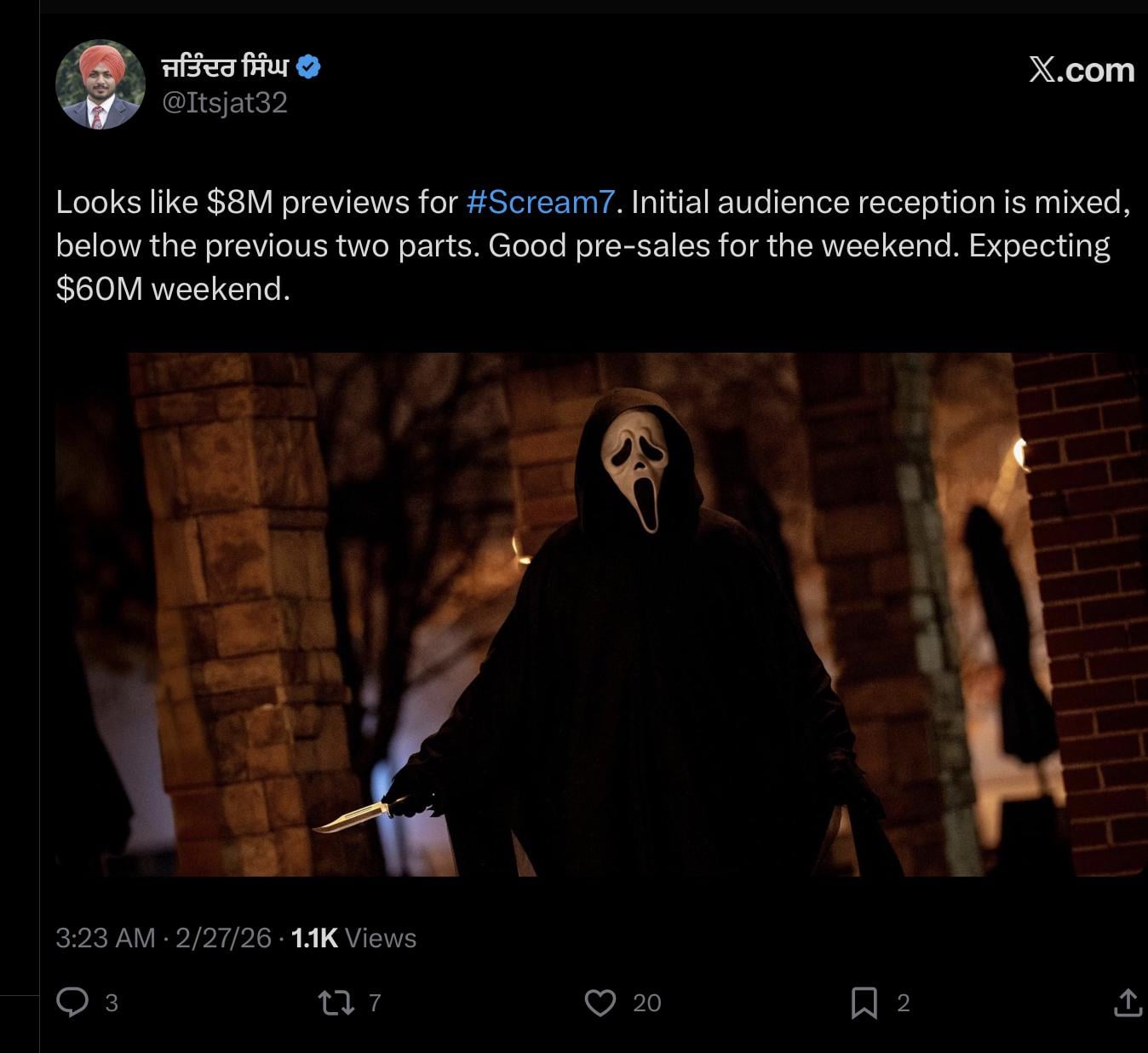 Looks like $8M previews for #Scream7. Initial audience reception is mixed, below the previous two parts. Good pre-sales for the weekend. Expecting $60M weekend.