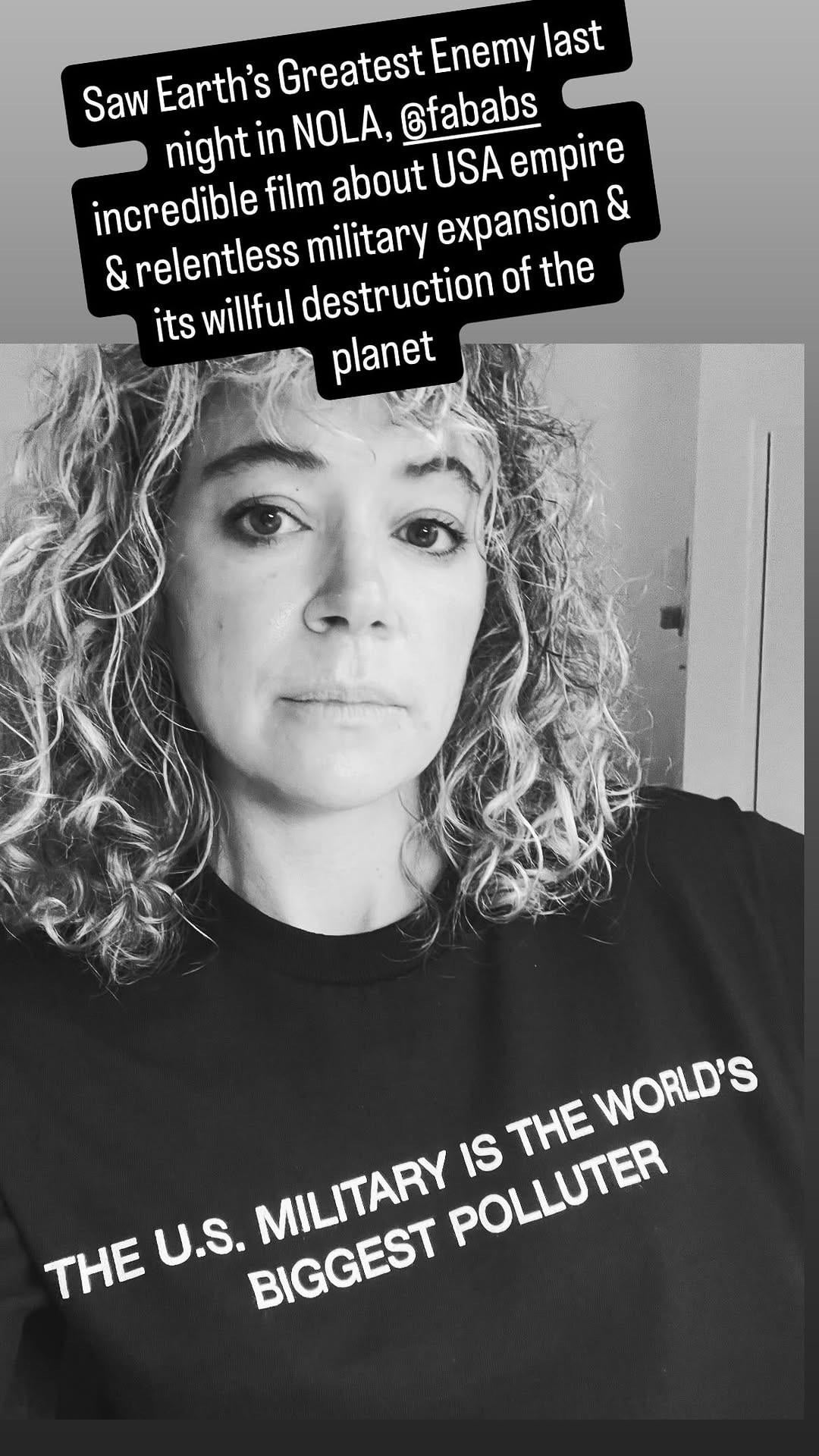 Tatiana Maslany recommending the film ‘Earth’s Greatest Enemy’ while wearing a shirt that says “THE U.S. MILITARY IS THE WORLD’S BIGGEST POLLUTER”February 27, 2026