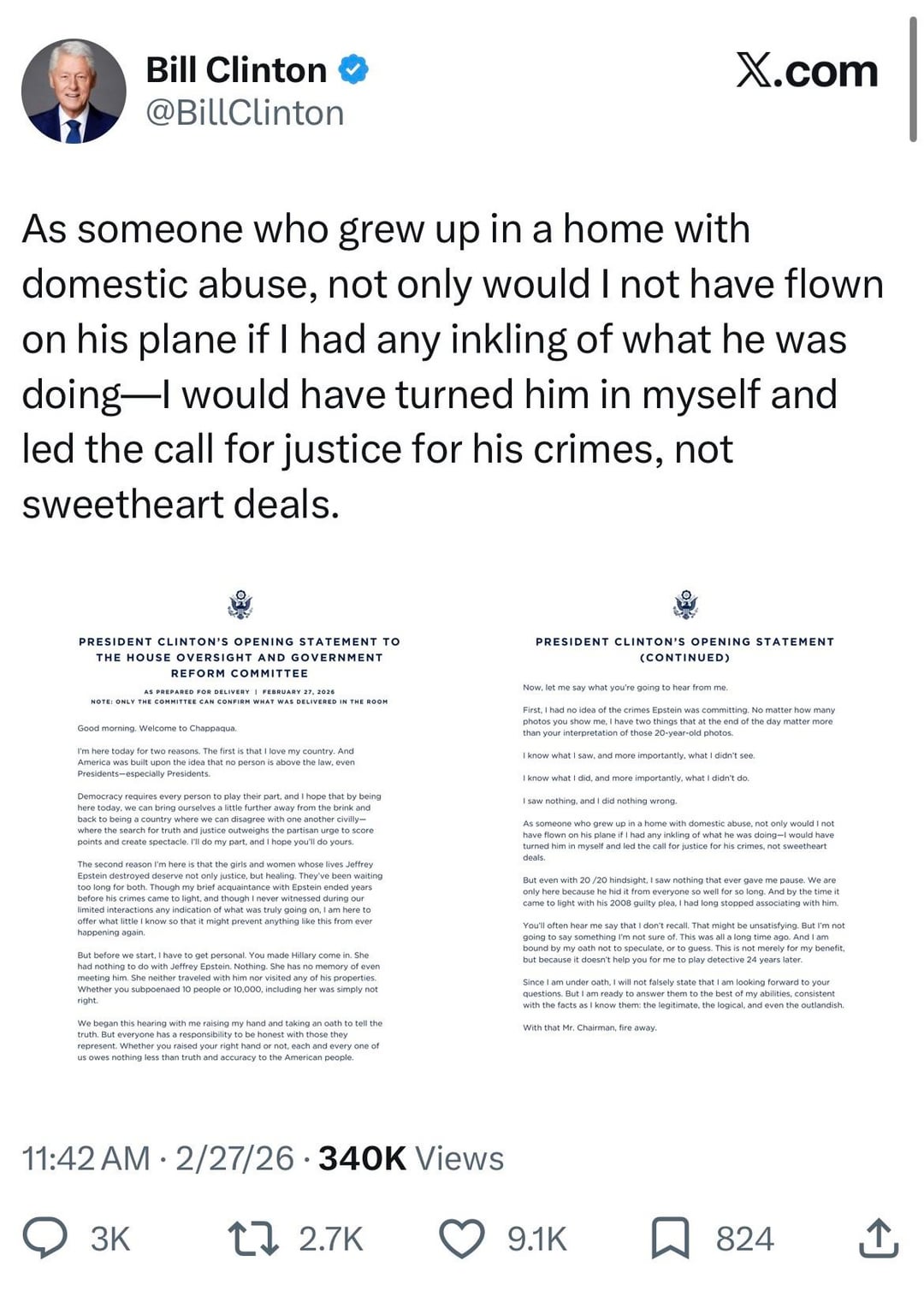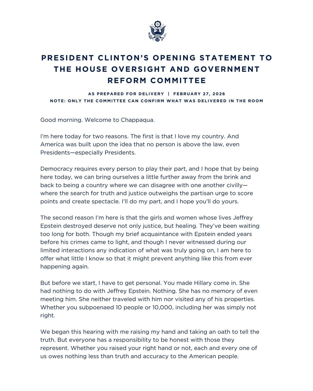 Bill Clinton Opening Statement, ahead of his deposition to the House Oversight Committee today, in regards to his relationship with Jefferey Epstein