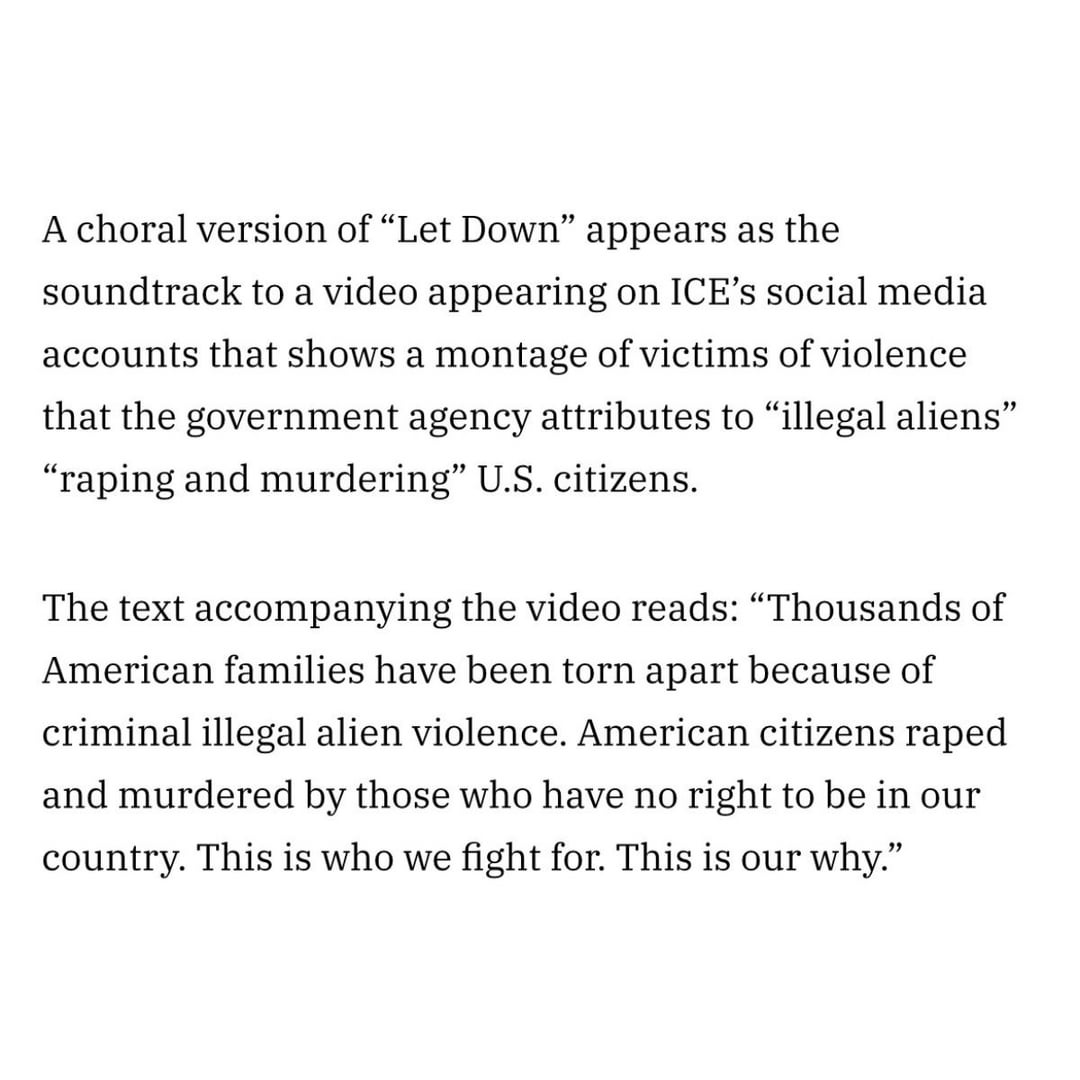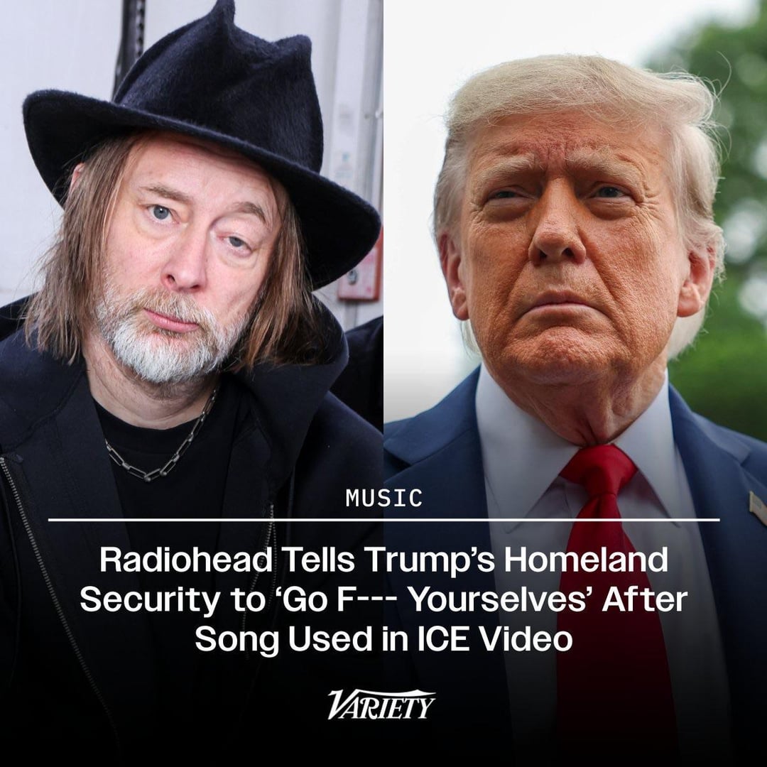 Radiohead tells Trump’s Department of Homeland Security to ‘go fuck yourselves’ after the agency used their song ‘Let Down’ in a pro-ICE video: “It ain’t funny, this song means a lot to us and other people, and you don’t get to appropriate it without a fight.”